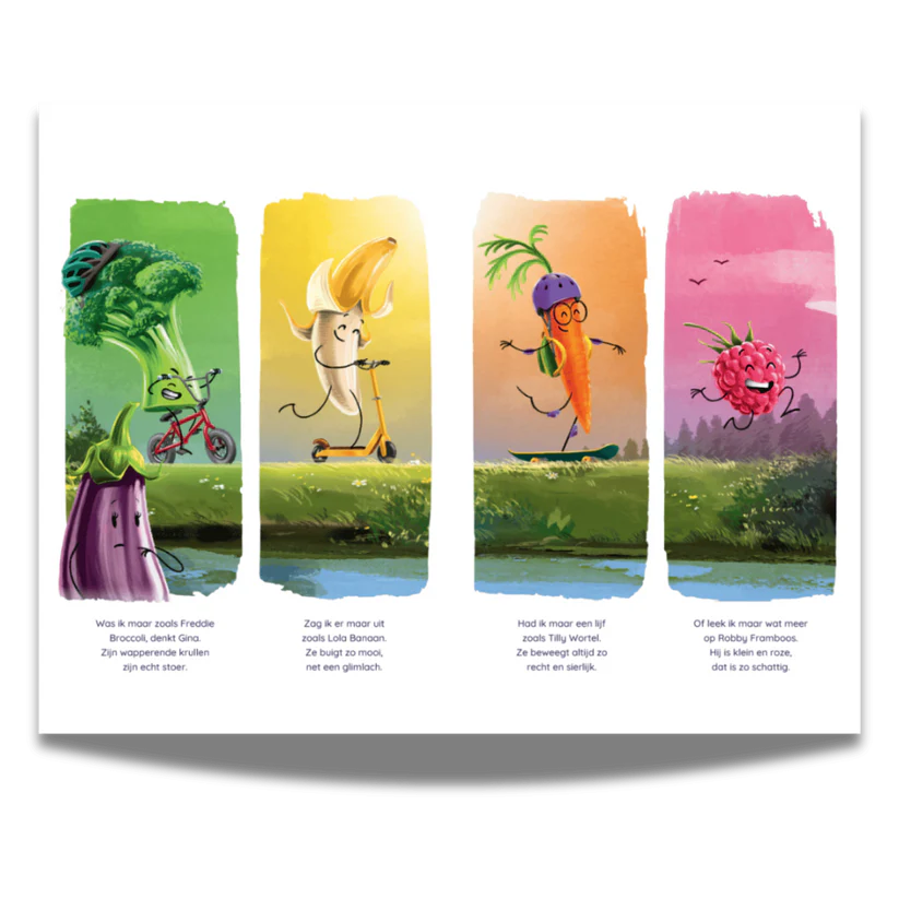 In het prentenboek “Goed in mijn schil” maken kinderen kennis met Gina, een aubergine die zich onzeker voelt over zichzelf. Het prentenboek vertelt op een warme en herkenbare manier dat iedereen iets bijzonders heeft en dat je pas echt straalt als je het mooie in jezelf leert zien. Met kleurrijke illustraties en een positieve boodschap sluit dit verhaal mooi aan bij de missie van HÖNGRY: fruit en groenten koppelen aan verhalen die kinderen laten groeien van binnen én van buiten.