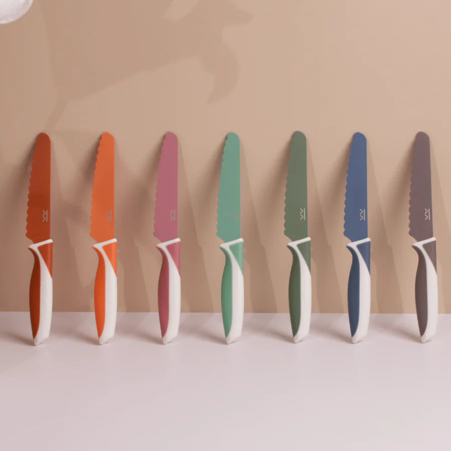 Dit unieke mes van het Australische merk Kiddikutter heeft afgeronde kartels in roestvrij staal, waardoor het niet snijdt bij aanraking, maar wel door voedsel heen komt met een zaagbeweging. Dit mes is ideaal om de zelfstandigheid van je kindje te bevorderen en hen op een veilige manier te laten deelnemen aan kookactiviteiten. De vrolijke kleur en het kindvriendelijke ontwerp maken het Kiddikutter mes een favoriet in elke keuken.