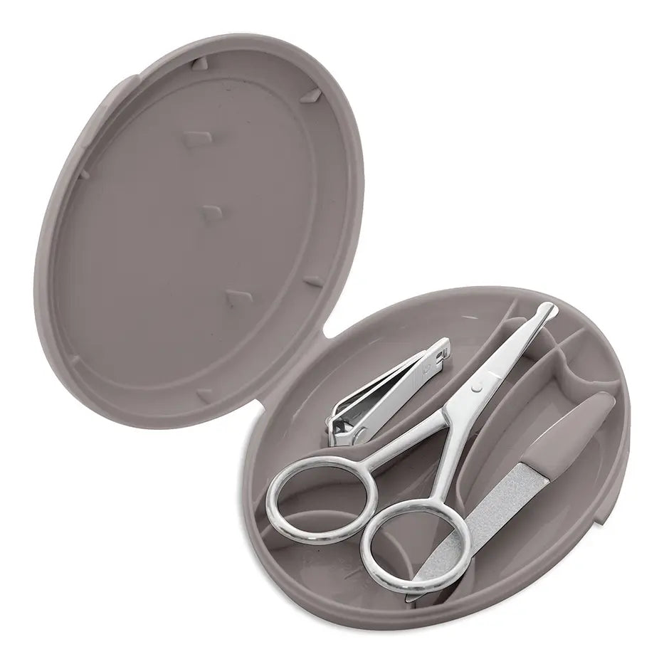 De manicureset bestaat uit een nagelvijltje, een nagelknippertje, en een roestvrijstalen babynagelschaartje met afgeronde uiteinden. Elk onderdeel is speciaal ontworpen met oog voor de tere huid en het kleine formaat van babyhandjes. Het RVS schaartje is slijtvast, roestbestendig en extra veilig in gebruik.