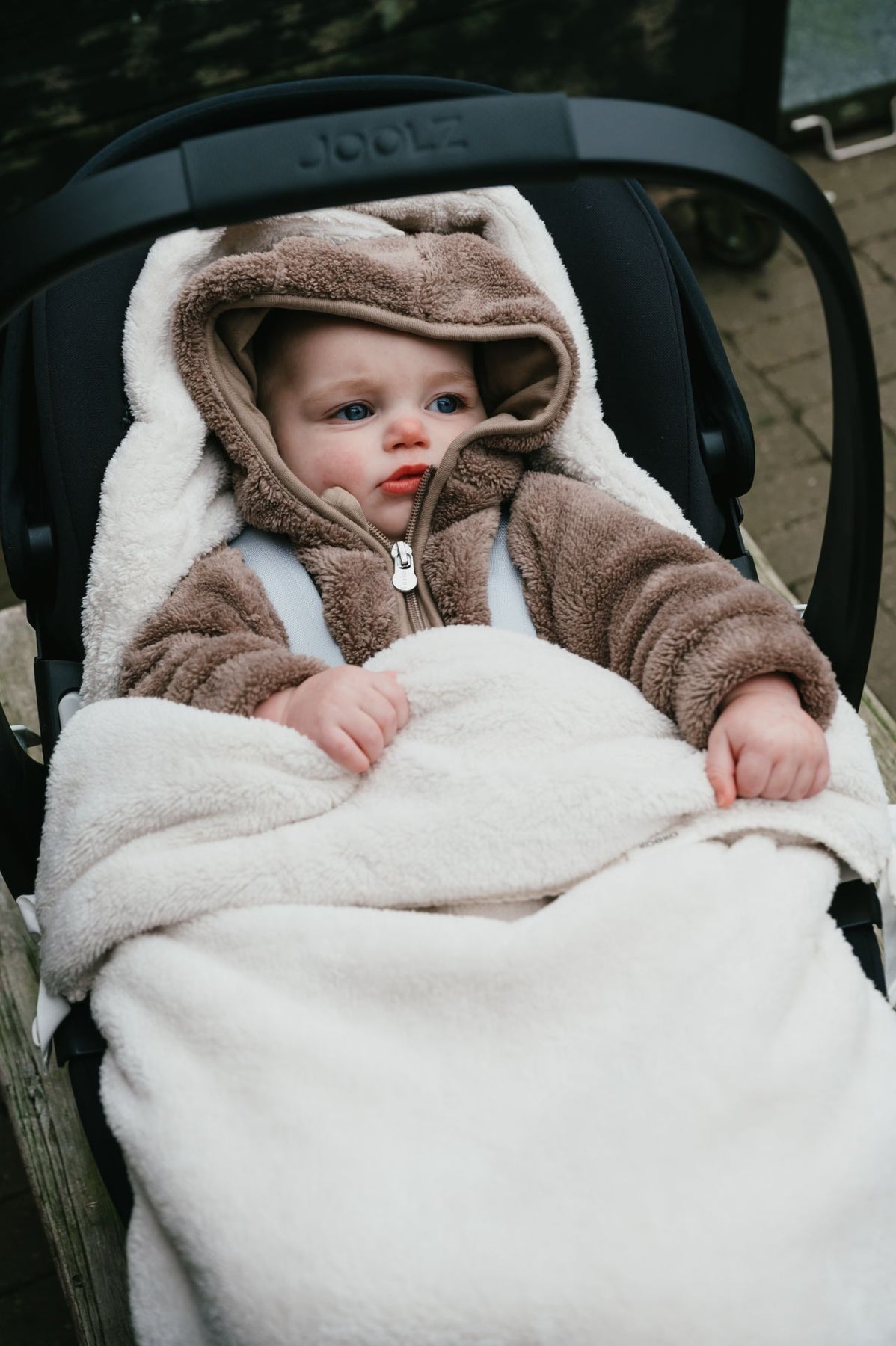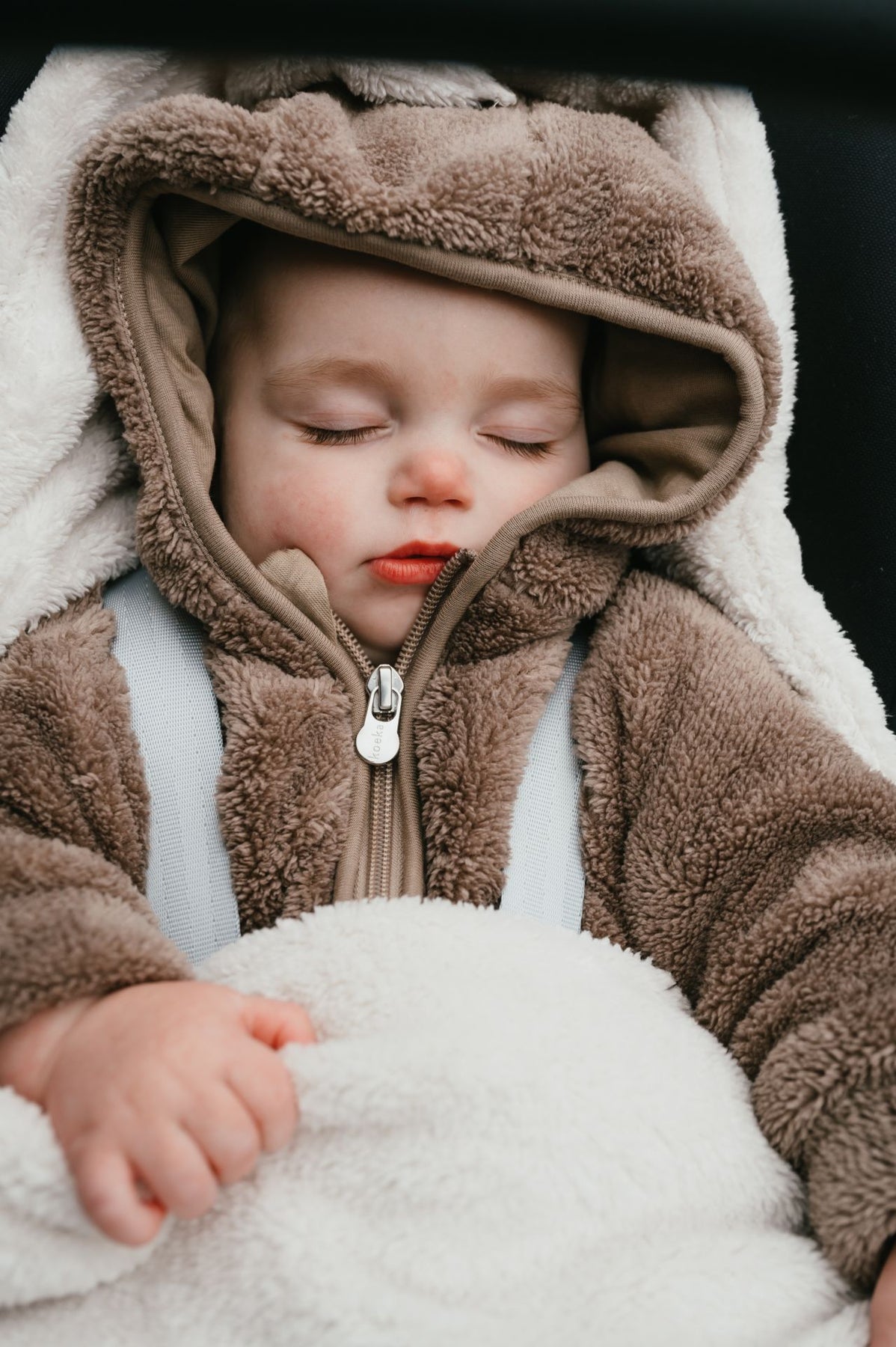 De buitenzijde is uitgevoerd in de knuffelzachte Malmo teddy stof – geliefd om zijn aaibaarheid en cosy uitstraling. De kleur Pebble, een zachte grijstint, past moeiteloos bij vrijwel elke autostoel en is eenvoudig te combineren met andere accessoires.
