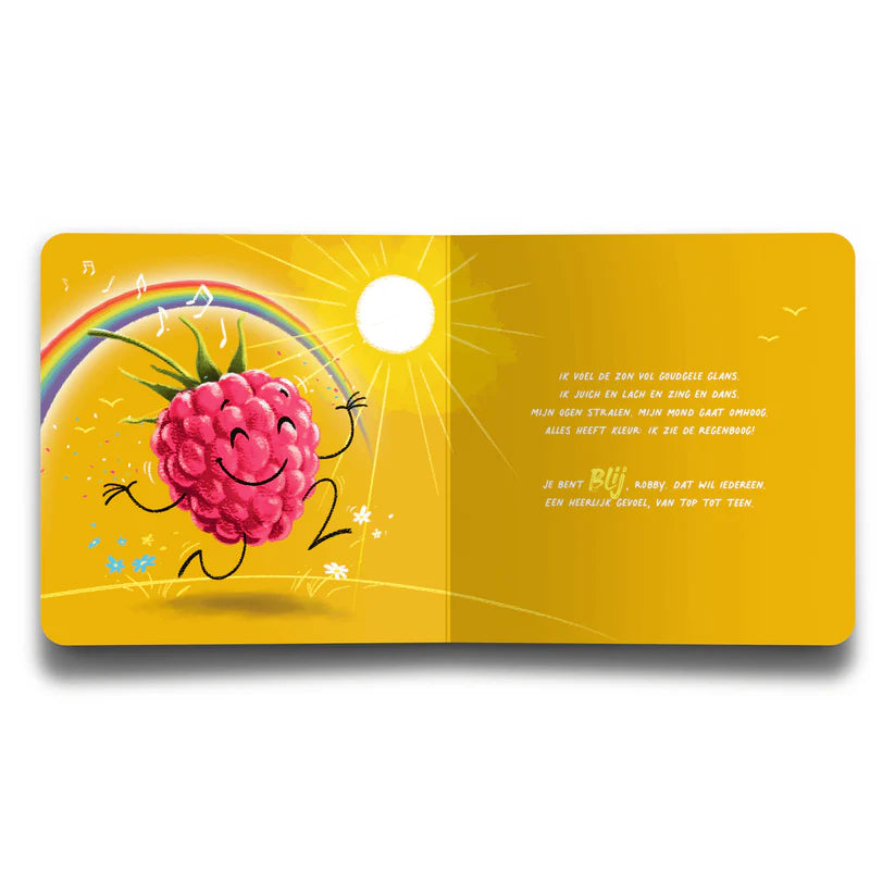 In het vrolijke en gevoelige kartonboek “Jij maakt mij framblij” maken kinderen kennis met Robby Framboos en zijn vrienden – een kleurrijke bende van fruit- en groentefiguren die elk hun eigen emoties beleven. Dit fantasierijke prentenboek op rijm helpt jonge kinderen op speelse wijze gevoelens herkennen, benoemen en begrijpen.