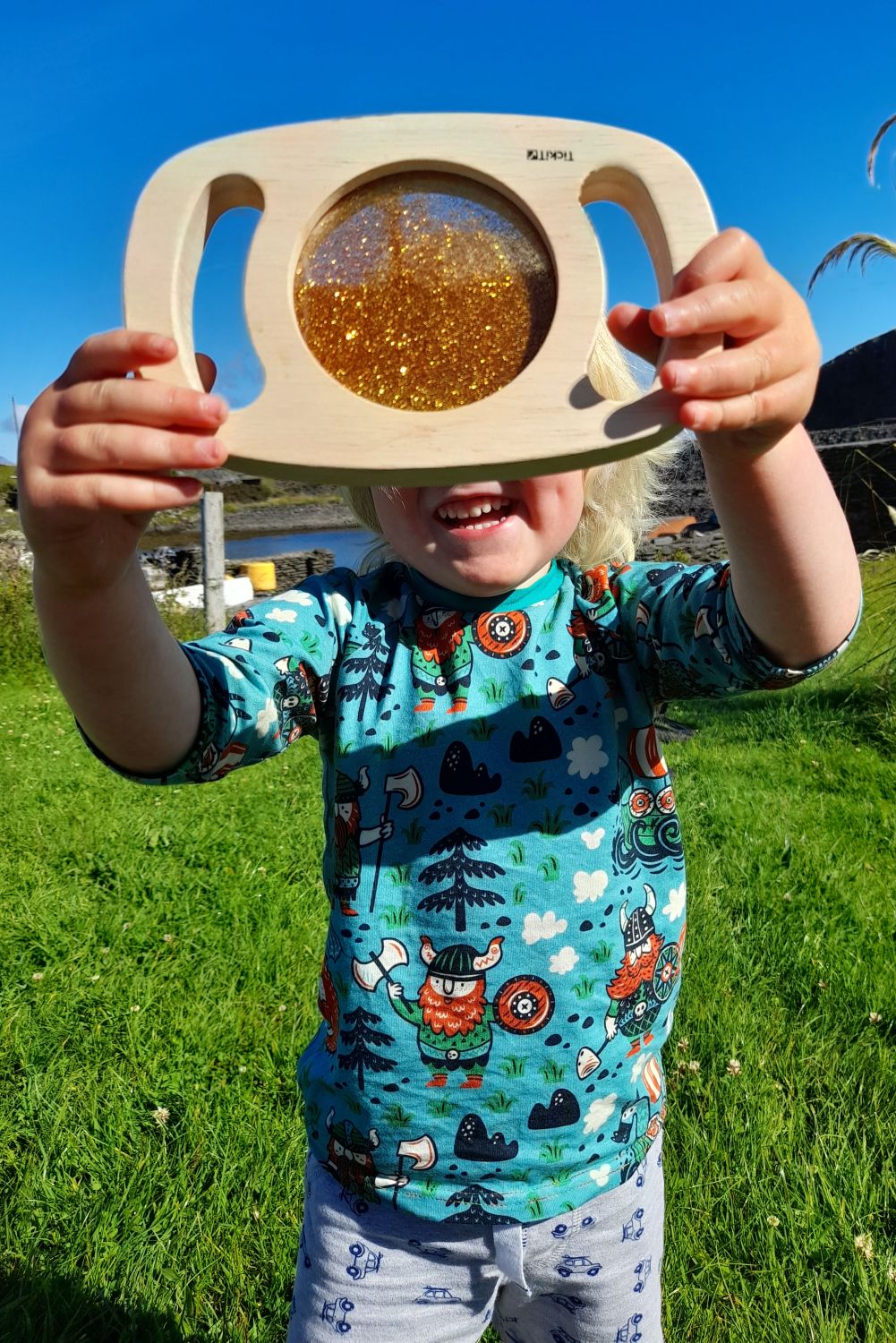 Dit activiteitenspeelgoed, onderdeel van de ckit® Easy Hold-serie, heeft een stevig frame van massief rubberhout met handige handvatten, perfect voor kleine handjes. Het glinsterende gouden paneel biedt een fascinerende zintuiglijke ervaring. Terwijl het glittermateriaal draait en wervelt, wordt de nieuwsgierigheid van je kindje geprikkeld.