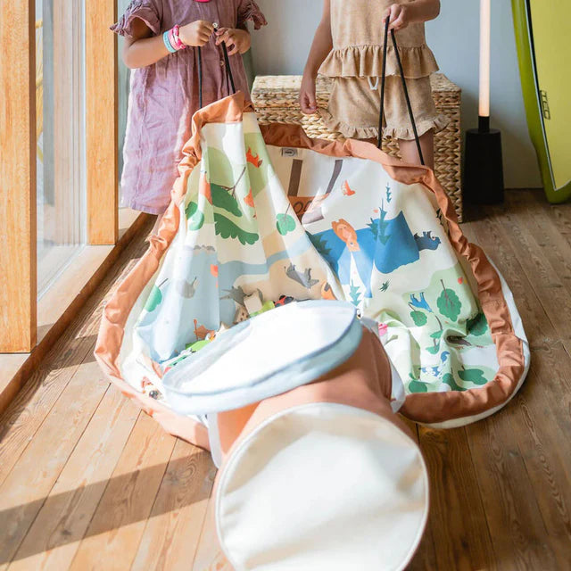 Met de Play & Go SOO Zoo haal je het beste van twee werelden in huis: een ruime speeltapijt én een handige opbergmand in één stijlvol ontwerp. Laat je kindje zich uitleven tussen vrolijke diertjes op het speeldeken van Ø140 cm, en ruim daarna in één trek alles netjes op – zonder gedoe.