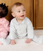 De drukknoopsluiting aan de voorzijde en tussen de beentjes maakt verschonen snel en eenvoudig, terwijl het subtiele witte hartje en het klassieke kraagje zorgen voor een zachte, verfijnde look.