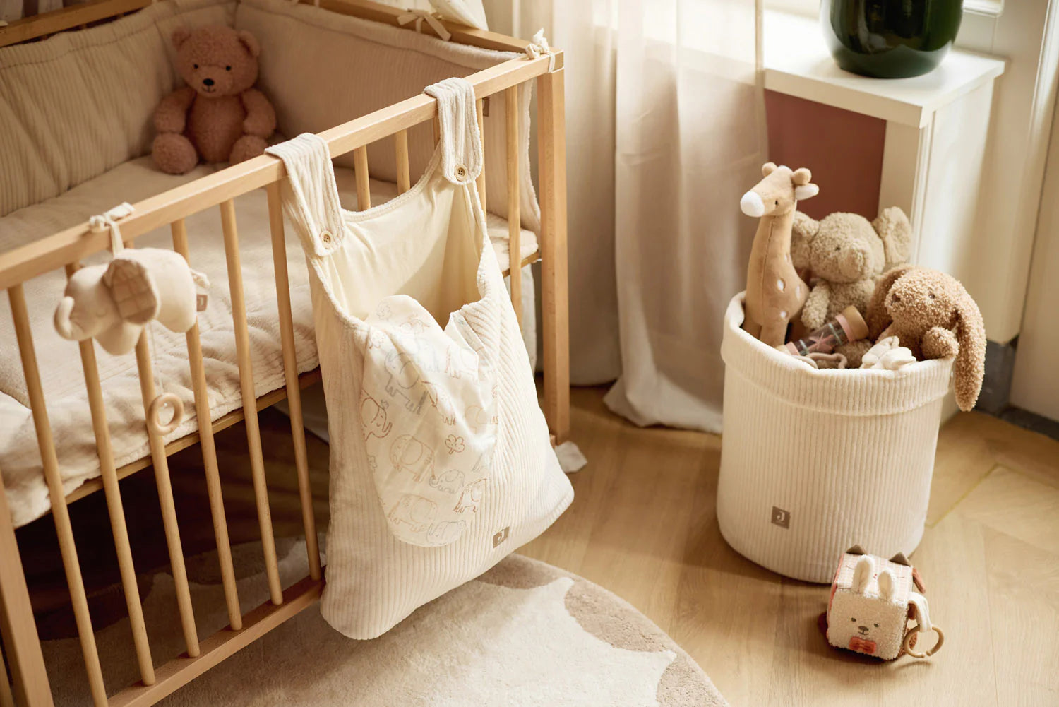 Dankzij het tijdloze design en de neutrale kleur past deze opbergzak moeiteloos in elk interieur. Een zachte, praktische must-have die de babykamer netjes en gezellig houdt.