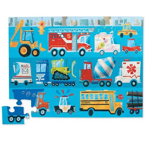 De puzzel toont een levendige scène met verschillende voertuigen zoals brandweerwagens, graafmachines, vrachtwagens en meer. De grote stukken zijn makkelijk vast te pakken door kleine kinderhanden en helpen bij de ontwikkeling van de fijne motoriek, visuele herkenning en concentratie.
