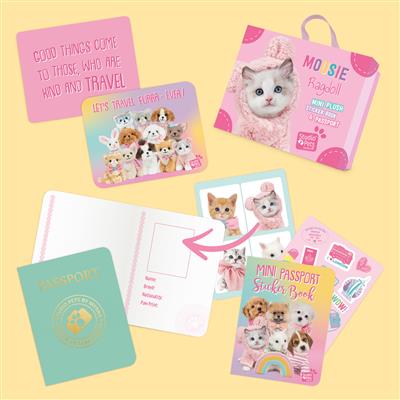 Mousie komt in een stijlvolle cadeaukoffer, perfect om haar overal mee naartoe te nemen. In de koffer vind je een gepersonaliseerd paspoortje én een stickervel met 66 vrolijke stickertjes, zodat kinderen het paspoort van hun nieuwe pluche vriendinnetje helemaal naar eigen smaak kunnen versieren.