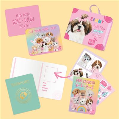 Deze mini knuffel komt verpakt in een stijlvolle kofferset voorzien van Sammy’s eigen foto, een paspoortje en een stickervel met 66 vrolijke stickers, inclusief haar pasfoto. Zo kunnen kinderen het paspoort van hun pluchen puppy volledig personaliseren en hun eigen fantasiewereld tot leven brengen.