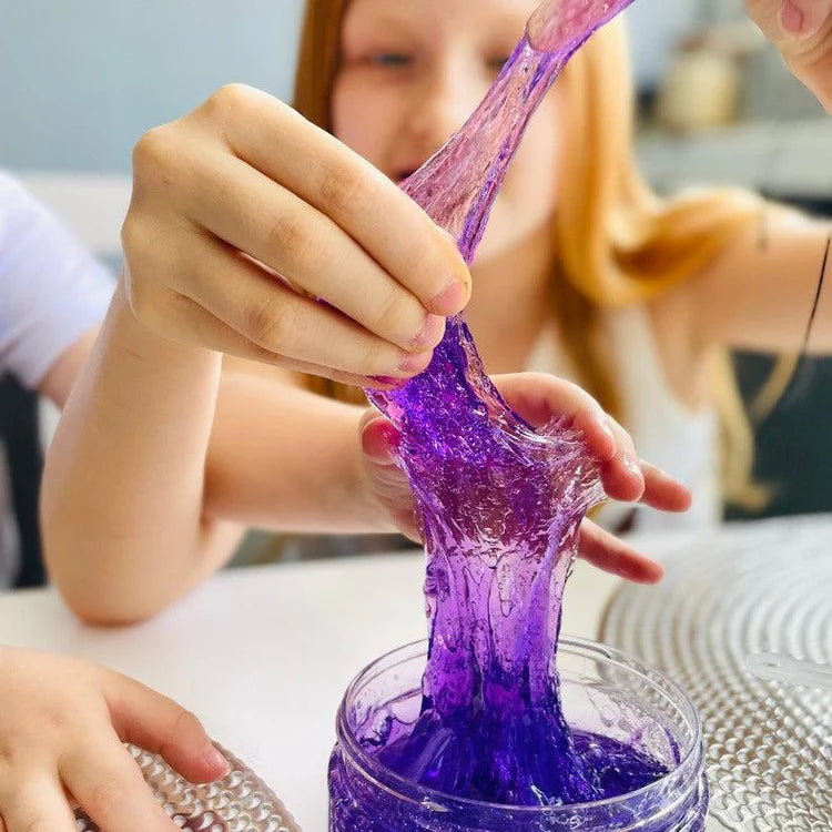 Het slijm verandert magisch van kleur – van paars naar groen – afhankelijk van temperatuur en beweging. Voeg de fluo gele balletjes toe voor een spectaculair visueel effect en een unieke textuurbeleving.