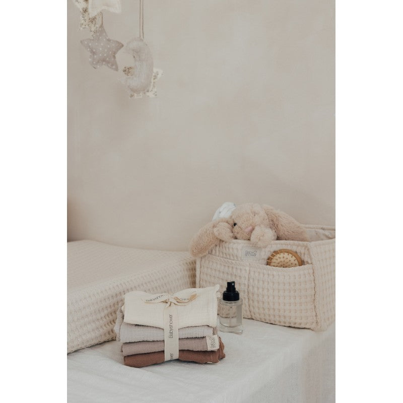 De Babyshower Tetradoek Set (4-pack) in de zachte Latte tinten is een onmisbare basic voor elke ouder. Deze set bevat vier middelgrote hydrofiele doeken van 70 x 70 cm, vervaardigd uit 100% biologisch katoen in zachte, effen kleuren met een dusty uitstraling.