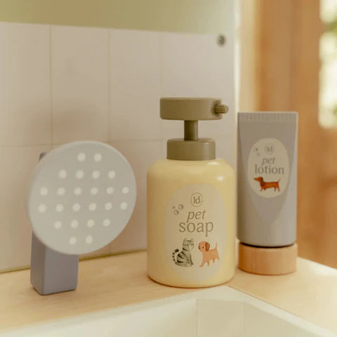 De houten dierenartsenkoffer zit boordevol accessoires om knuffels en speelgoeddiertjes te verzorgen: van een stethoscoop en thermometer tot verbandjes en spuitjes. De set bevat ook een inklapbare praktijk met behandelruimte, wachtkamer en opbergvakken – allemaal in stijlvolle pasteltinten en kindvriendelijk design.