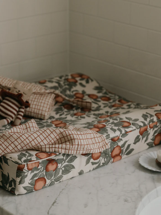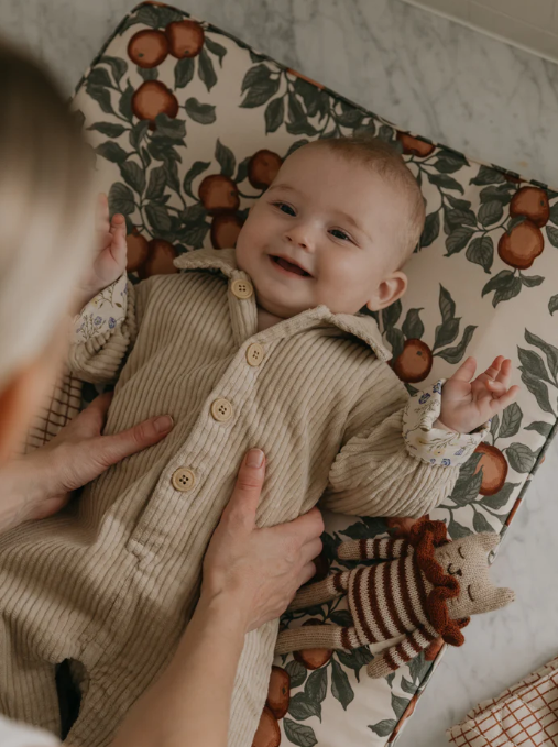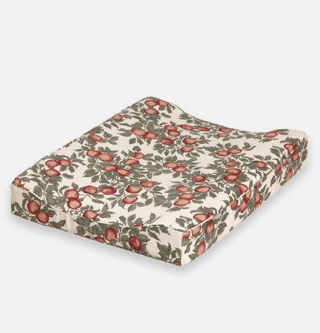 Het handgetekende "Pomme"-motief geeft een frisse, speelse uitstraling aan de babykamer, terwijl de hoge randen van het bijpassende kussen extra veiligheid en ondersteuning bieden tijdens het verschonen. De hoes is gemakkelijk afneembaar en wasbaar, waardoor hygiëne en gebruiksgemak gegarandeerd zijn.