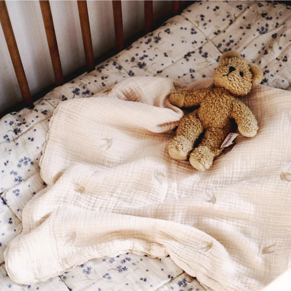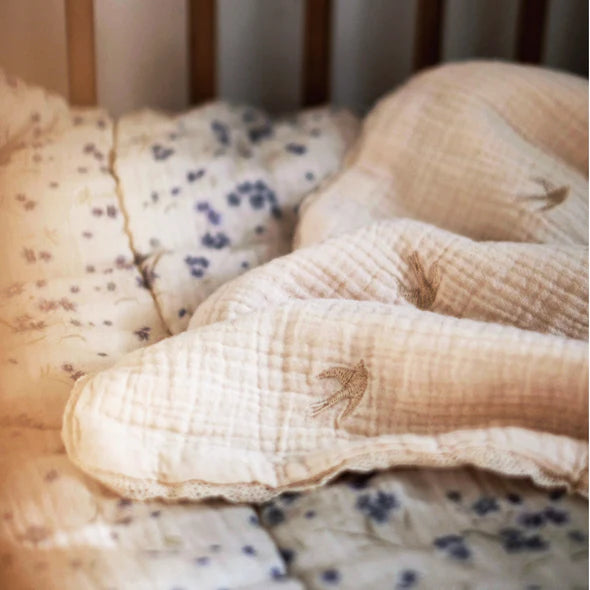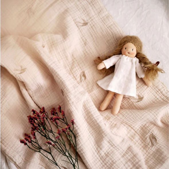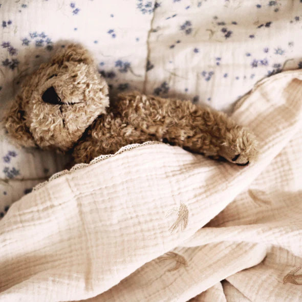 Het deken is versierd met 36 sierlijk geborduurde zwaluwen, uitgevoerd in subtiel parelmoer borduurgaren. Deze vrolijke vogeltjes symboliseren vrijheid en speelsheid – perfect passend bij het onschuldige karakter van je kleintje. De ecru kleur is tijdloos en gemakkelijk te combineren met andere babytextiel of interieurstijlen.