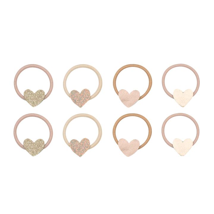 De hartjes zijn vervaardigd uit een mix van suedette, metallic en glitterstoffen en bevestigd aan sterke, maar zachte elastiekjes van klein formaat. Ze zijn bijzonder geschikt voor fijn haar of voor het vastzetten van kleinere haarpartijen, zoals vlechtuiteinden of mini staartjes.