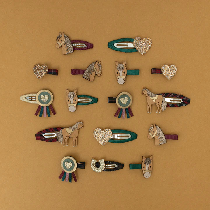 Voor kleine paardenliefhebbers die graag in stijl de dag door galopperen: de Pony Pals mini clic clacs van Mimi & Lula zijn een droom! Deze set van vijf mini haarspelden brengt een speelse mix van glitter, suedette en metallic stoffen samen in de vorm van schattige pony’s, een rozet, een hartje en een hoefijzer. Elk clipje is liefdevol afgewerkt met fijne grosgrain lintstaartjes voor extra flair.