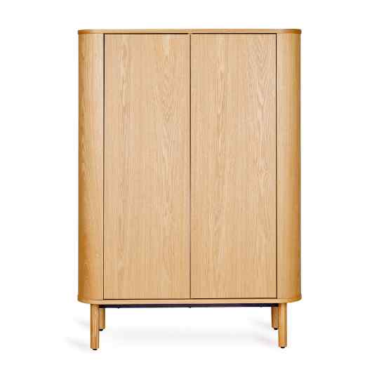 De omkadering en poten zijn vervaardigd uit massief essenhout, wat zorgt voor een warme, natuurlijke uitstraling en een stevige basis. De deuren zijn gemaakt van met es gefineerd MDF, wat bijdraagt aan een duurzame en verfijnde afwerking. Dankzij het geïntegreerde push-systeem openen en sluiten de deuren moeiteloos en veilig – zonder zichtbare handgrepen, wat het strakke design versterkt.